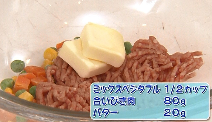 耐熱ボウルに、ミックスベジタブル、ひき肉、バターを入れます。