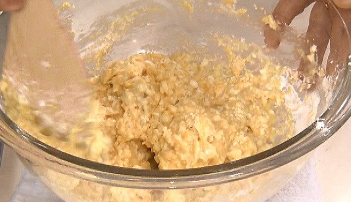 卵、小麦粉、塩を加えて、粉っぽさが無くなるまでしっかりと混ぜます。