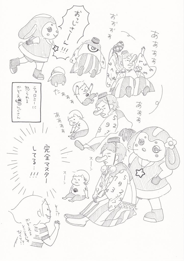 ファミリーコンサートの舞台で転げ回るかぞえてんぐさん。いつの間にか息子がその動きをバッチリマスター!