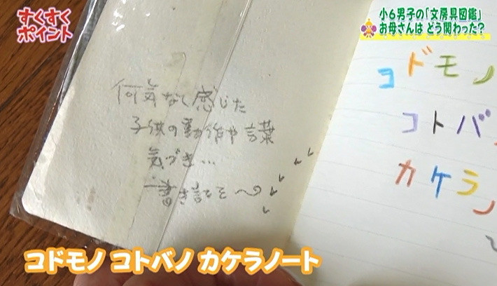 また、お母さんは、健太郎くんが言ったおもしろい言葉や行動を、生まれたときから「コドモノ コトバノ カケラノート」に書き留めていました。例えば、食事のときに小さなアリがいるのを見て、「ママ大変!アリさんだ。ここがレストランだと思ってきたんじゃない?」と言ったそうです。