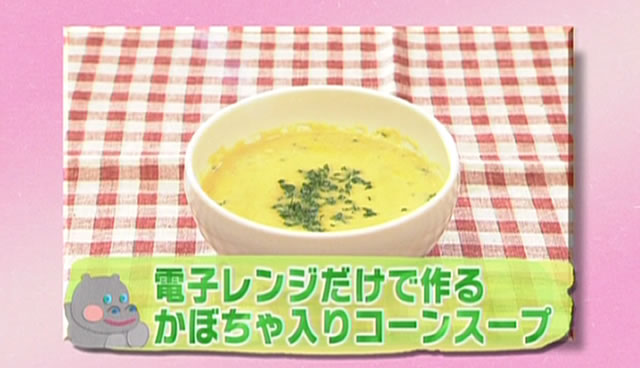 (2)電子レンジからかぼちゃを取り出して、やわらかくなったら、フォークで潰す。
