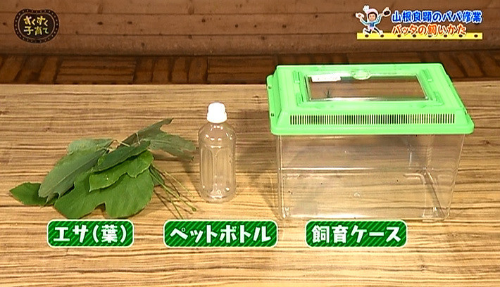 用意するのは、飼育ケースとペットボトル、エサとなる葉です。