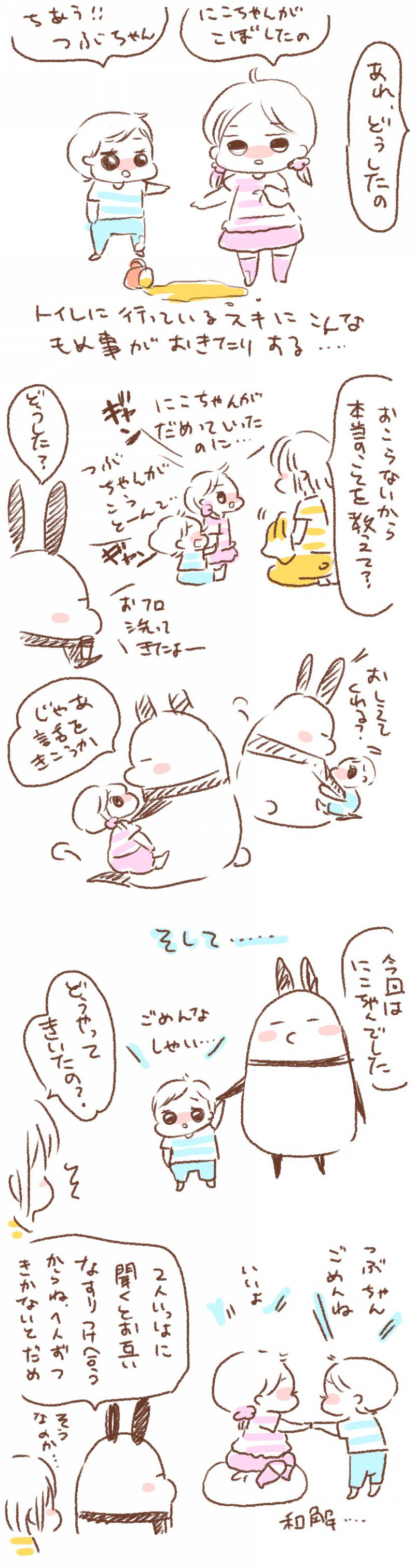 問題はそんな牛乳よりも「つぶちゃんがやった」「にこちゃんがやった」