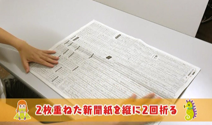 まず、2枚重ねた新聞紙を、縦に2回半分に折って細長くします。