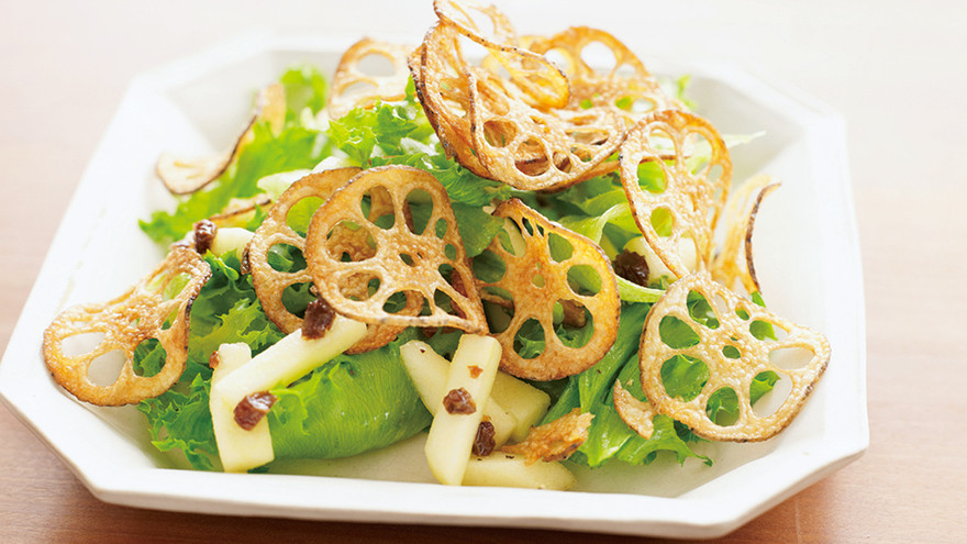 カリッと香ばしいれんこんチップが主役のサラダです。りんごやレーズンの甘みが絶妙にマッチ!