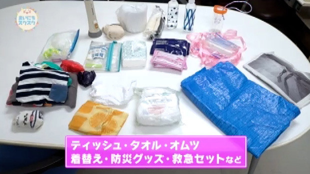 ティッシュやタオル、オムツに着替え、防災グッズや救急セットなどをリュックサックに入れて持っていくそうです。