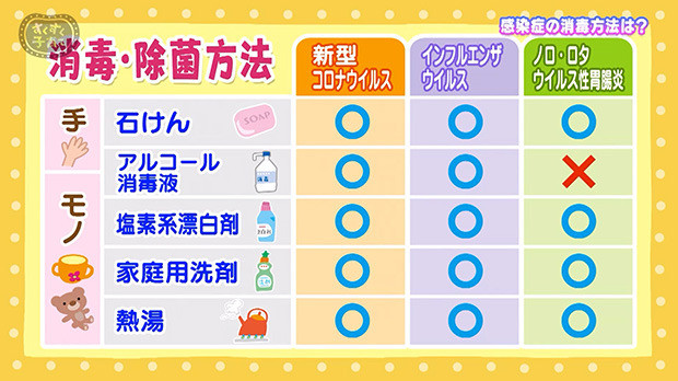 これは、消毒・除菌方法をまとめた表です。例えば、石けんでの手洗いは、上記すべてのウイルスに有効です。一方で、アルコール消毒液は、新型コロナウイルスには有効ですが、ノロ・ロタのような胃腸炎のウイルスには効きません。胃腸炎に関しては、地道な手洗いが非常に大切になってきます。