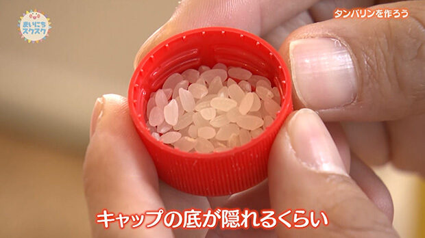 続いて、ペットボトルのキャップに底が隠れるくらいのお米を入れます。