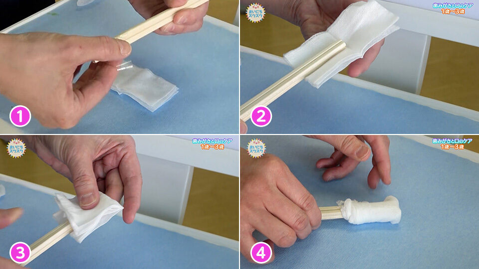 このころになると、舌の力が強くなり、歯ブラシを押し返してしまうことがあります。割り箸にガーゼを巻いたものを使ってみましょう。