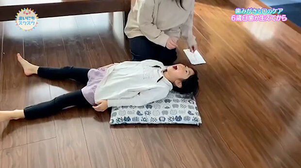 ひざの間でなくてもいいので、口の中がきちんと見える位置に子どもを寝かせます。使う歯ブラシは2種類です。