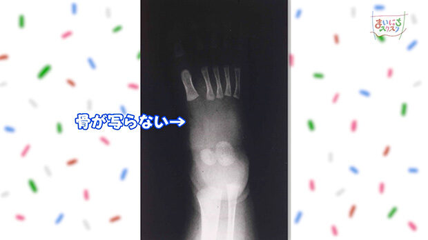 生まれたばかりの赤ちゃんの足のX線写真です。軟骨の部分が多いため、骨がはっきりと写りません。大人とほぼ同じように骨が写るようになるのは6歳ごろです。