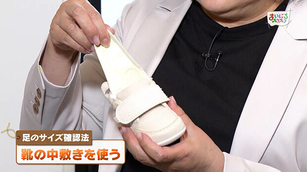 でも、動く子どもの足を正しく測るのは大変です。そんなときは、靴の中敷きでもチェックできます。