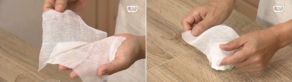 使い古しのガーゼハンカチを切り取り、一枚にしてガラス瓶にかぶせます。