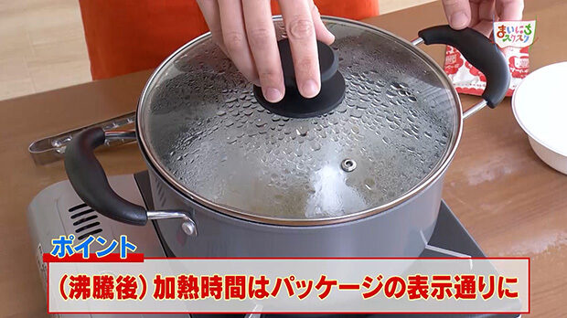 ふたをして火をつけます。沸騰したら火力を弱め、およそ20分間加熱します。そのあと火を止めて、ふたをしたまま10分間蒸らせば完成です。
