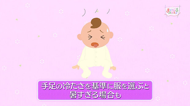 赤ちゃんは、熱を逃がすために汗をかいて、放熱のときに汗が冷えて、手足が冷たくなることがあります。手足が冷たいからといって、寒がっているとは限りません。赤ちゃんの手足の冷たさを基準にすると厚着になりがちです。