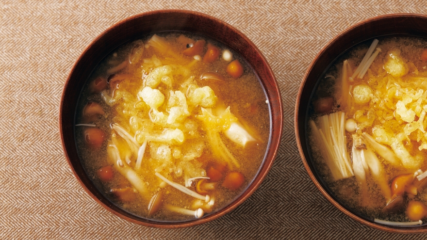 しめじ、えのきだけ、なめこ。たっぷり入れたきのこのうまみと揚げ玉のコクが堪能できるみそ汁がこちら。揚げ玉は食べる寸前に入れましょう♪これなら残ってしまいがちな揚げ玉も、おいしく使い切れそうですね。