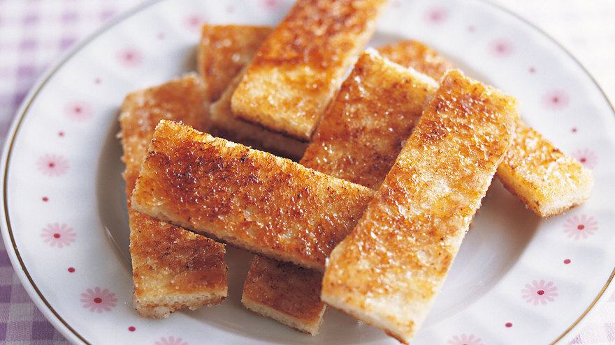 バターの香りとカリカリのキャラメルがあとを引くおいしさ!食パン、バター、グラニュー糖さえあれば作れます。おやつにもぴったり。