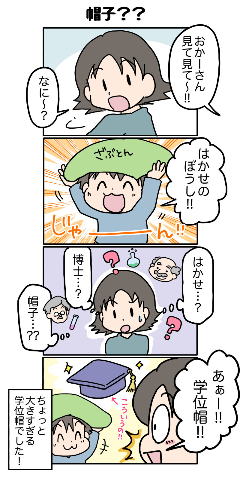 どこで見かけたのか知らないけど、 いつの間にかたーすけ君は 「博士がかぶっている帽子」のイメージを獲得していたようです! でも座布団はちょっと大きすぎるかな…!笑
