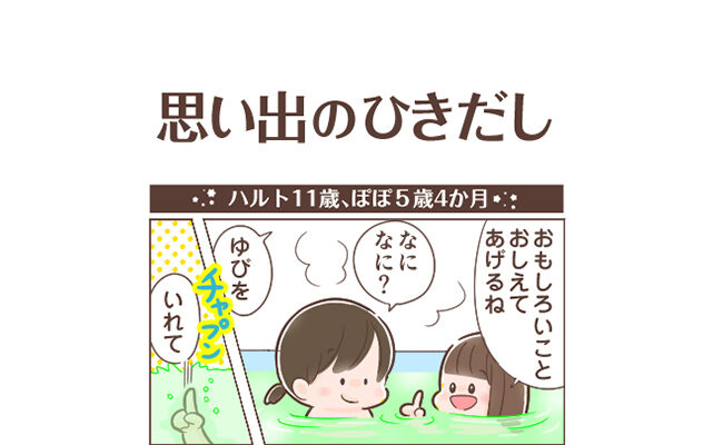 子どもとの関わりの中で、忘れていた思い出がひきだされることがよくあります。この遊びを私に教えてくれたのは、父だったかなぁ・・・母だったかなぁ・・・そこは思い出せないのですが、小さい頃これが面白くて何度もやった記憶があります。光の屈折とか難しい話は置いといて。娘の手がさらに小さく見えて、「赤ちゃんみたいだね〜」と楽しみました。
