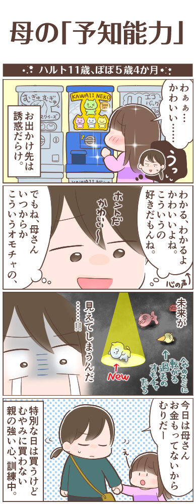 カプセルトイだったり、お子様セットのオモチャだったり、世の中、誘惑が多くて大変ですね。それがまたかわいいのでついゆるんで買っちゃったりしてました。私も好きなので・・・。 でもそのオモチャがしばらくして部屋に転がっていたりすると、悲しいし、ものやお金を大切にすることも伝えいかなくちゃなと、心に決めた母なのでした。