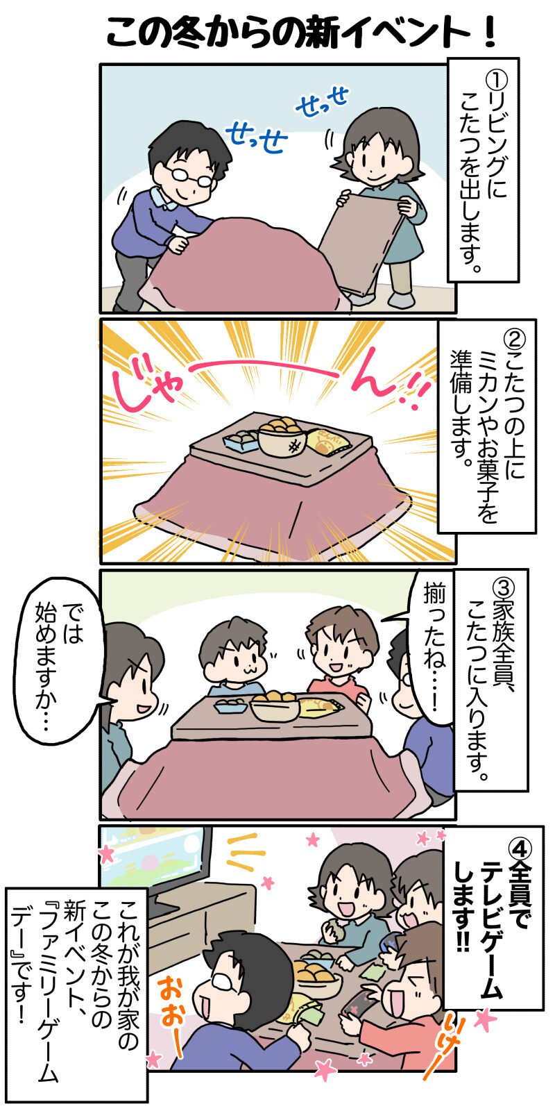 でも、たまーに、家族全員が揃っていて予定の無い週末には、しまってあったこたつを出してつまめる食べ物をいっぱい用意して家族みんなでゲーム大会します!