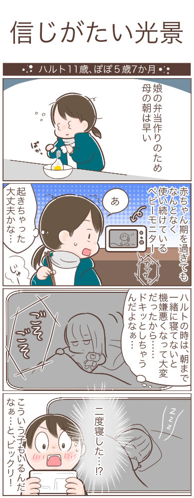 上の子がこの年頃の頃(6年前)は、不安が強い子だったこともあり、一緒に寝ていないと怒ったり不機嫌になったりで大変でした。 それもあって、ある日娘がすんなり二度寝している姿をモニター越しに見て、ちょっと信じられなかったです。 同じ部屋でお父さんもハルトも寝ていたし、ぬいぐるみのくまちゃんもいたからかな。 そろそろモニターがなくても大丈夫か・・・と思った母なのでした。