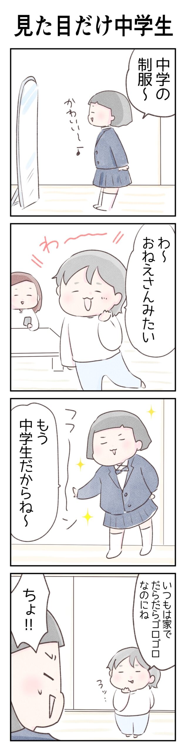 中学の制服を着ると、ぐっとお姉さんになりますね。 しかし、次女からのツッコミが…(笑)