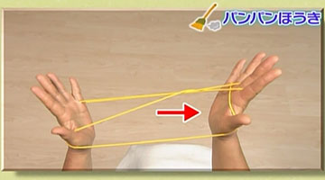 3.最後に「パン!」と手を打ち、右手の親指と小指からひもを外して引っ張ると「ほうき」の出来上がり!
