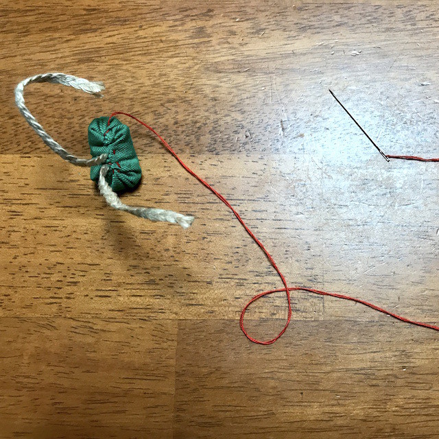 針はそのまま、上にリボンや紐の上に磁石を置き、その上に綿を詰めて、糸を引きます。