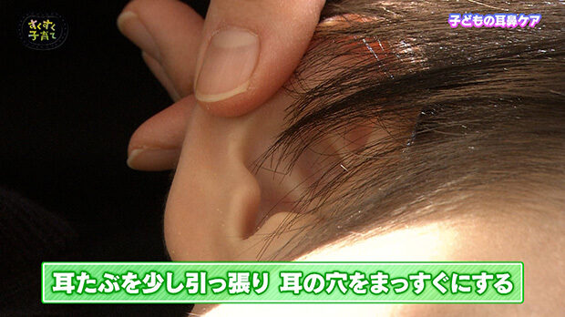 耳そうじをするときは、まず、耳たぶを少し引っ張ります。耳の穴がまっすぐになり、中がよく見えます。