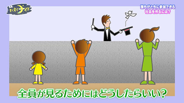 背の高さの違う3人の子どもたちがいます。壁の向こうではマジックをやっていますが、全員が見るためにはどうしたらいいでしょうか。