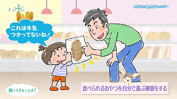 また、買物で食べることができるおやつを自分で選ぶ練習もしてみましょう。そういった練習を通して、食物アレルギーであることを自覚し、安全な食べ物を選ぶ力が養われていくと思います。
